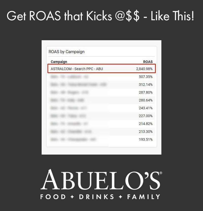 Specifically, in PPC, Abuelo’s is enjoying a better than 28:1 return on advertising spend (ROAS) with ASTRALCOM campaigns.